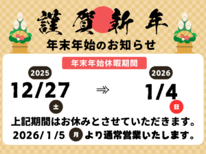 誠に勝手ながら下記の期間は年末年始休業とさせていただきます。 年末年始休業期間2025年12月27日(土)~2026年1月4日(日) これからも、一層のお引き立てを賜りますようお願い申し上げます。